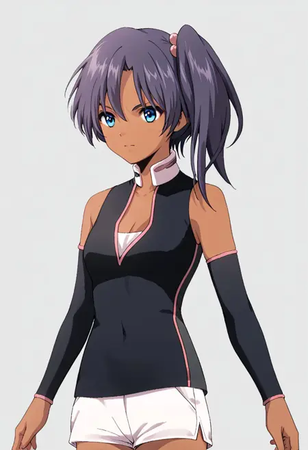 rachel ransom, detached sleeves, side ponytail, dark skin, blue eyes, purple hair, white short pants