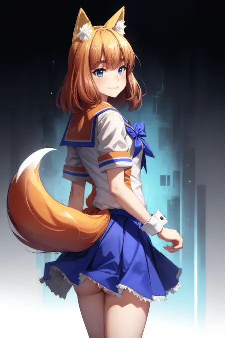 Add "bowtie, school uniform, sailor collar, blue pleated skirt, wrist cuffs, socks, orange shoes" for her typical look.