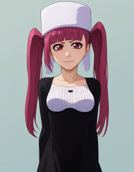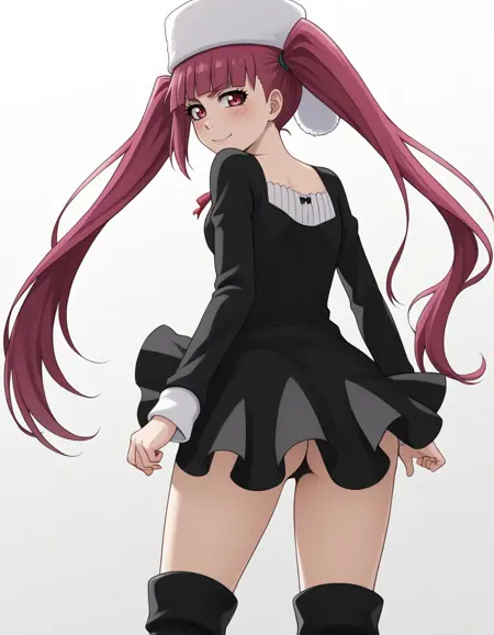 主要服装:黑色连衣裙、大腿长靴、白色帽子 -> 长袖(此部分较不稳定)