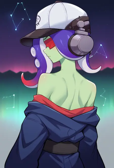 Dedf1sh, green skin, tentacle hair, multicolored hair, baseball cap, two-tone headwear, headphones