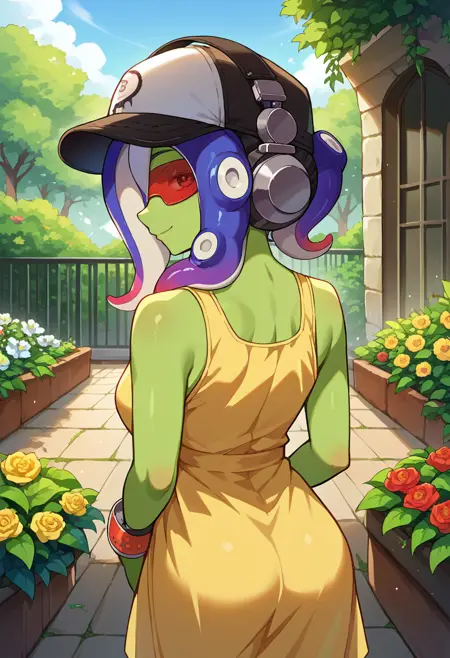 Dedf1sh, green skin, tentacle hair, multicolored hair, baseball cap, two-tone headwear, headphones, red-tinted eyewear, black dress, off shoulder, bra strap, short sleeves, bandaged arm, wristband, side slit, cross-laced slit