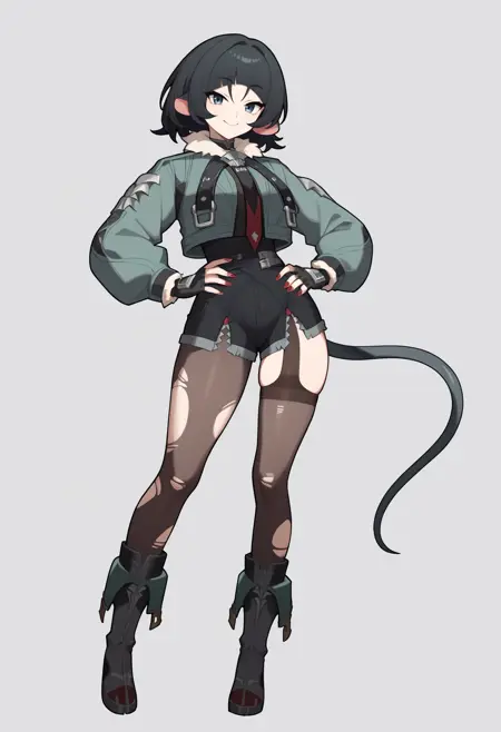 기본 의상 프롬프트: fur-trimmed jacket, green jacket, long sleeves, red necktie, high-waist black shorts, belt, fingerless gloves, single leg pantyhose, torn pantyhose, torn thighhighs, grey boots