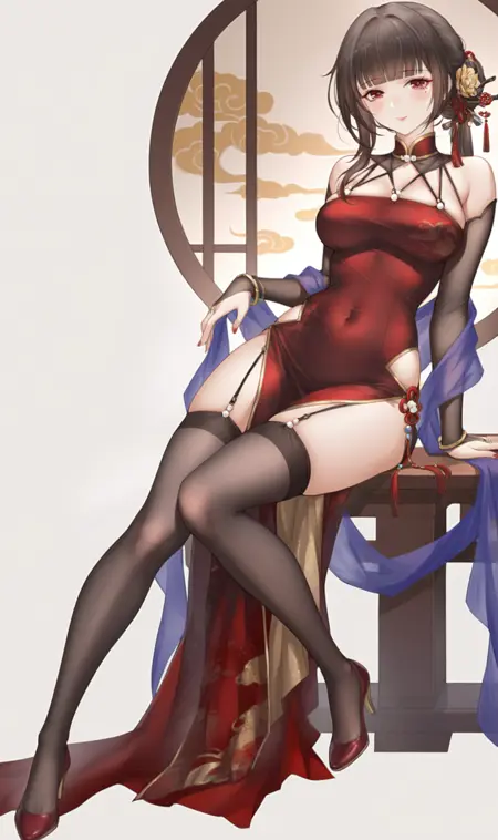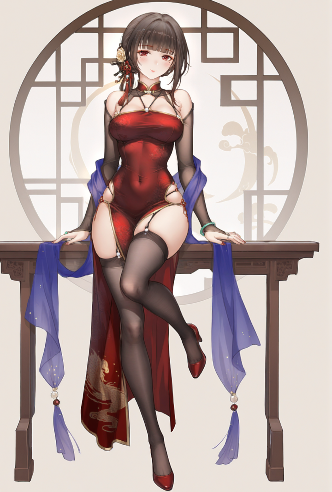 正面提示词: yat sen (style3), 1girl, solo, red dress, red eyes, covered navel, side slit, red footwear, full body, black thigh-highs, high heels, thighs, cleavage, pelvic curtain, closed mouth, hair flower, white background, mole under eye, black hair, medium breasts, single hair bun, tassel hair ornament, chinese knot, flower knot, panchang knot, china dress, chinese hairpin, hair stick, official alternate costume, blunt bangs, bracelet, blush, red nails, nail polish, detached sleeves, round window, mandarin collar, detached collar, collar, skin indentation, garter straps, clothing cutout, bare shoulders, ring, table, leaning on table, leg up, standing on one leg, hand on table, looking at viewer, elbow gloves, black elbow gloves, bridal gauntlets, black bridal gauntlets, smile, chair, blue shawl, hagoromo, cloud print, xiangyun, medium hair, <lora: yat sen (style3) v1.1:1>