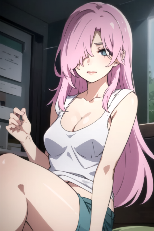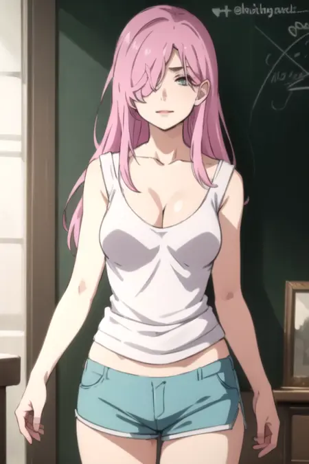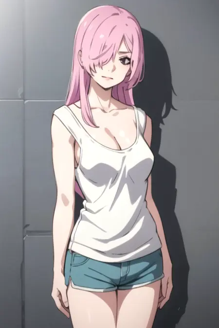 HeXia, 1girl, solo, long hair, medium breasts, white shirt, cleavage, pink hair, short shorts, hair over one eye, tank top, blue shorts, white eyes
