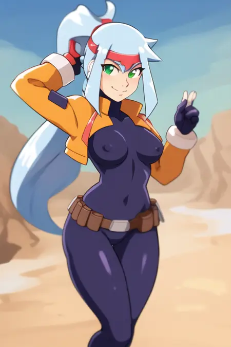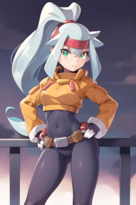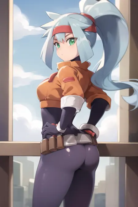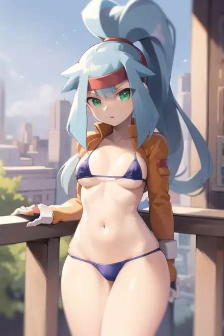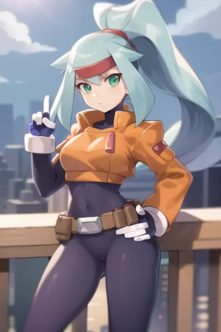 long hair, green eyes, gloves, jacket, bodysuit, ponytail, blue hair
