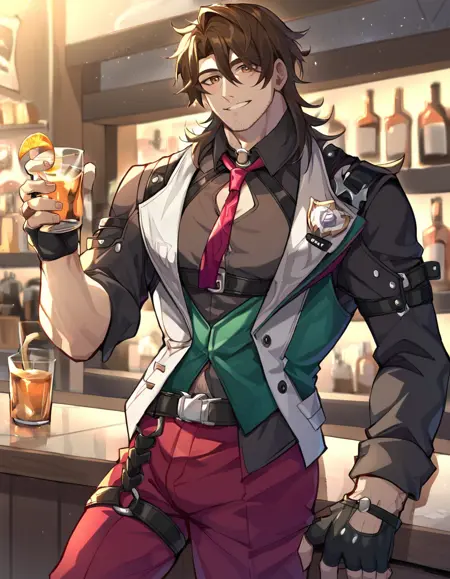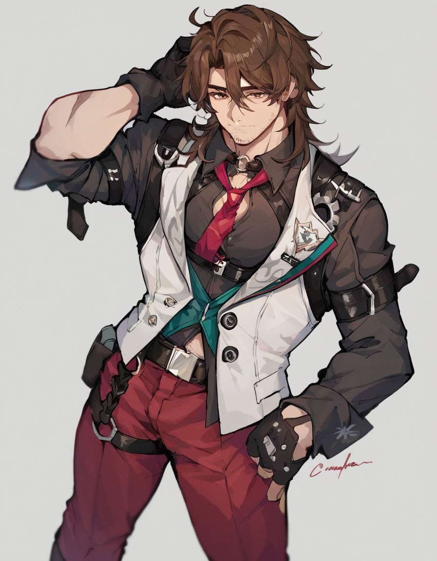 collared shirt, black shirt, black gloves, red pants, belt, black footwear