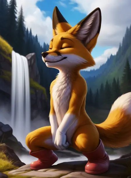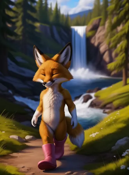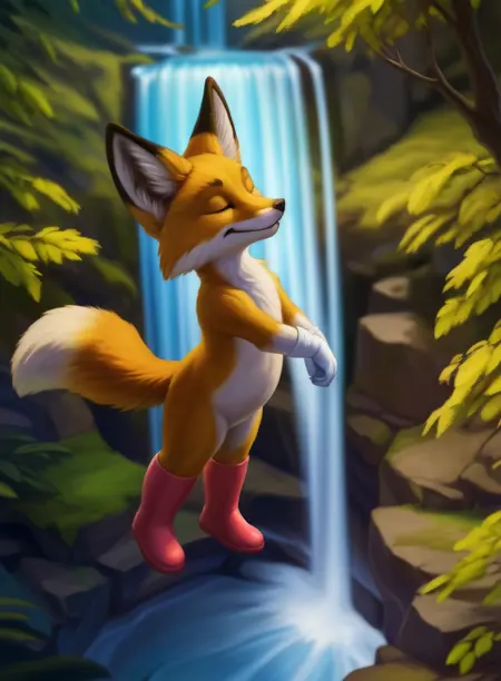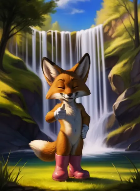 DonbeSluAra, fox, kitsune, red fur, red fur, pink boots, eyes closed, (white gloves, chibi,)