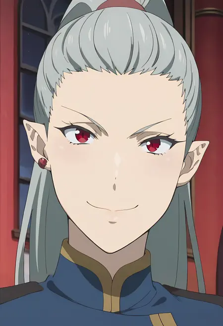 R0se, 1girl, very long hair, grey hair, ponytail, red eyes, pointy ears, large breasts, single earring