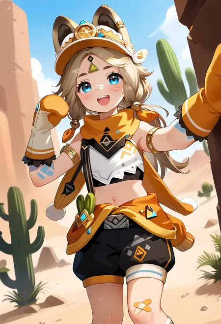 - black shorts,mittens,jacket around waist,hat,animal ears,midriff,navel