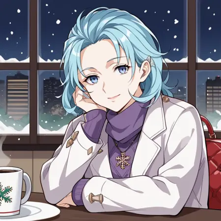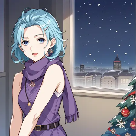 Eins_Xmas, 紫色连衣裙, 黑色腰带, 紫色围巾, 高领, 备用围巾, 雪花项链, 白色外套, 长袖, 白色袖子,