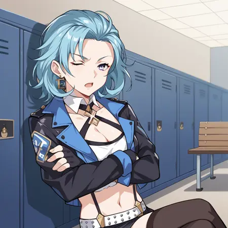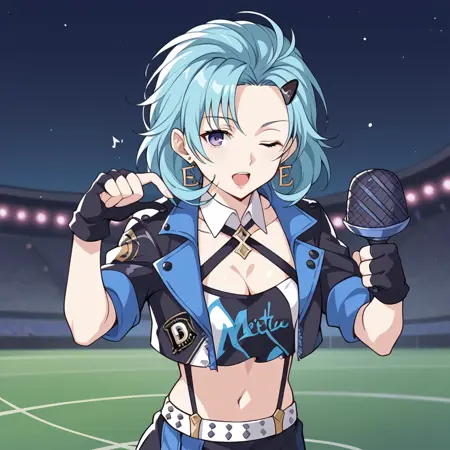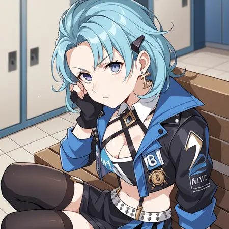 Eins_Idol, 短款夹克, 黑色夹克, 蓝色夹克, 背带, 迷你裙, 黑色裙子, 露脐上衣, 黑色衬衫, 露腹, 肚脐, 胸部显露, 交叉式吊带, 可拆卸衣领, 黑色项圈, 白色腰带, 饰品, 耳环, 吊袜带, 黑色过膝袜, 中长袖, 无指手套, 黑色手套,