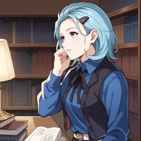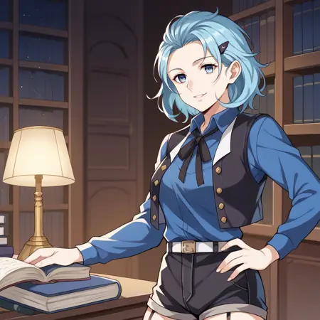 Eins_VN, 蓝色衬衫, 泡泡袖衬衫, 颈部丝带, 黑色丝带, 短款背心, 黑色背心, 黑色短裤, 短裤, 白色腰带, 长袖, 黑色过膝袜, 吊袜带,