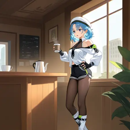 EinsHi3, Fol002, Ens_New, 淡い青い髪, 青い目, 中長髪, オフショルダーシャツ, 長いシャツ, ハルターネック, 白いシャツ, ファンシーロングスリーブ, スリーブスリット, 黒い手袋, 肘手袋, フィンガーレス手袋, 片脚タイツ, 片脚スリーブレッグ, 非対称レッグウェア, 黒いストラップ, 緑のトリム, 裸の肩, 白いヘアウェア, ベレー帽, 茶色のタイツ, 茶色のスリーブレッグ, 透けた胸元, 黒いネクタイ, 長いネクタイ, 黒いストール, ポロシャツカラー, 黒いチョーカー, フロントスリット, 黒いショートパンツ, 短いショートパンツ, お腹の露出, 白い膝上ブーツ,