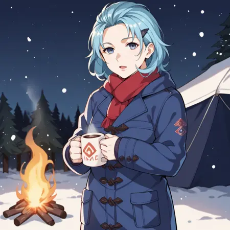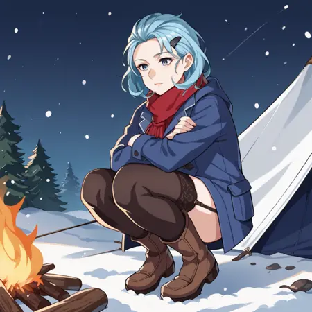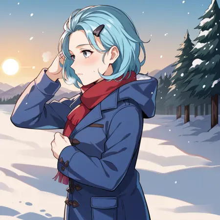 Eins_Wint, 冬季大衣, 蓝色大衣, 杜弗尔大衣, 红色围巾, 吊袜带, 黑色过膝袜, 连帽下垂, 长袖, 蓝色袖子,