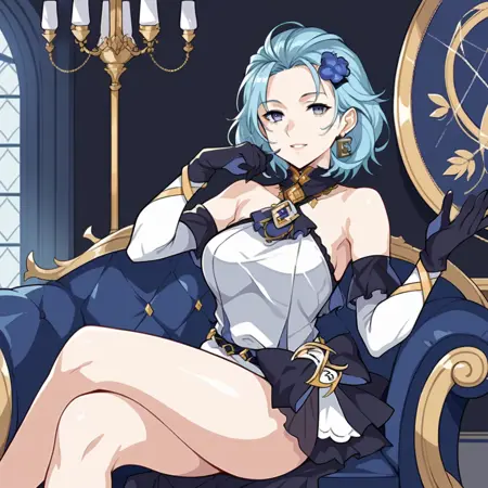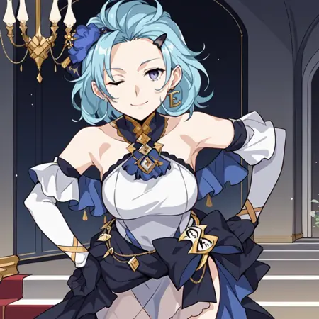 Eins_Muse, 吊带连衣裙, 白色连衣裙, 荷叶边连衣裙, 头发花饰, 蓝色花朵, 可拆卸袖子, 荷叶边袖子, 黑色手套, 白色袖子, 透明裙子, 荷叶边裙子, 黑色蝴蝶结, 白色裙子, 黑色裙子, 金色镶边, 饰品, 耳环,