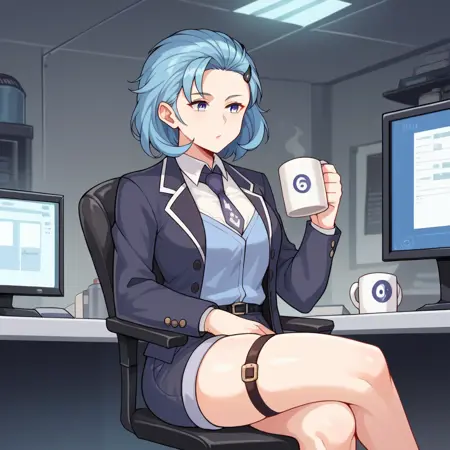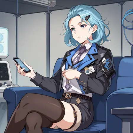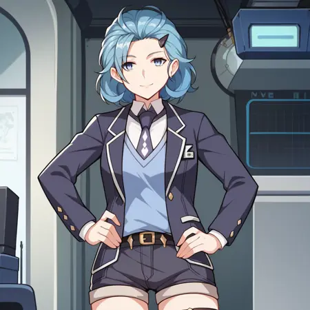 Eins_Def, 黑色西装外套, 白色衬衫, 蓝色背心, 蓝色领带, 有领衬衫, 开放式服装, 大腿绑带, 短裤, 黑色短裤, 黑色腰带, 长袖,