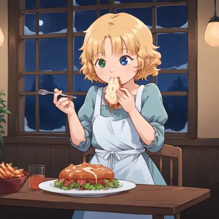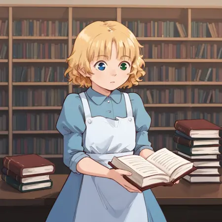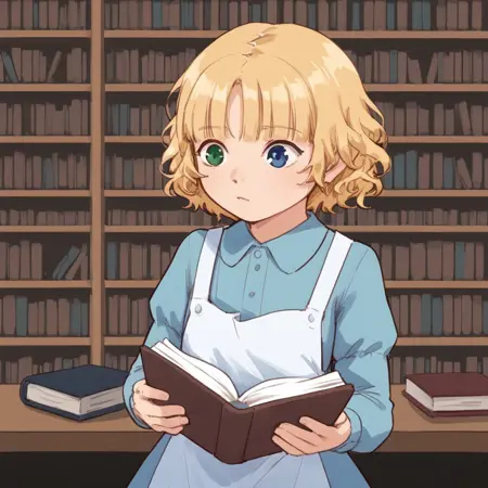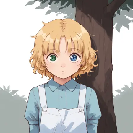 riley-davis, w0rm, blonde hair, 1girl, solo, blue eyes, heterochromia, green eyes, short hair,