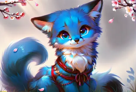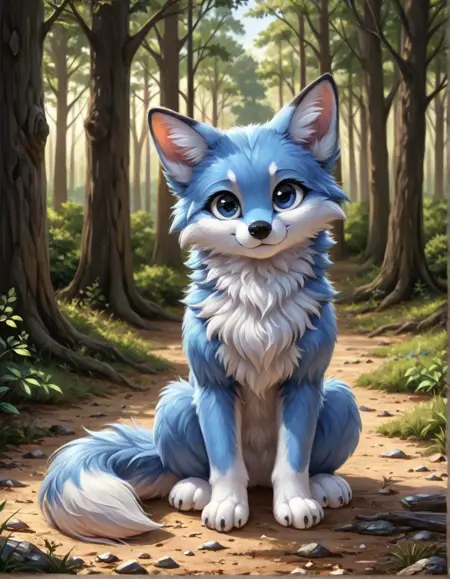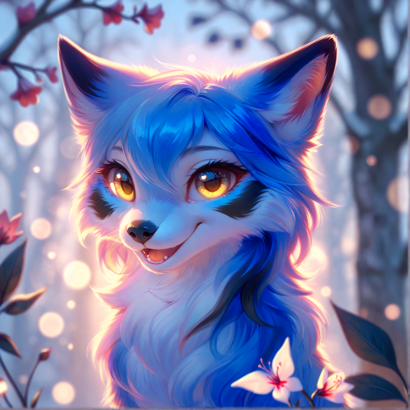 score_9, score_8_up, score_7_up, score_6_up, score_5_up, score_4_up, gentle_lighting, blurred_background, realistic, expressive_eyes, small_creature, soft_focus, light_bokeh, peaceful, whimsical, blue fox, golden eyes, realistic fur, fur patterns, black markings, open smile