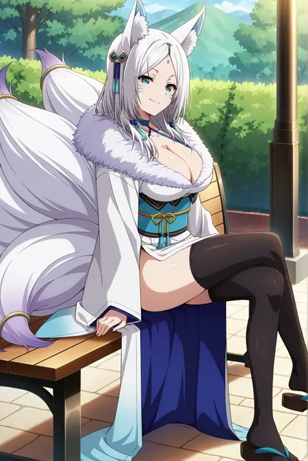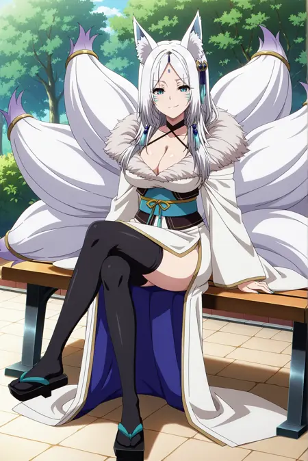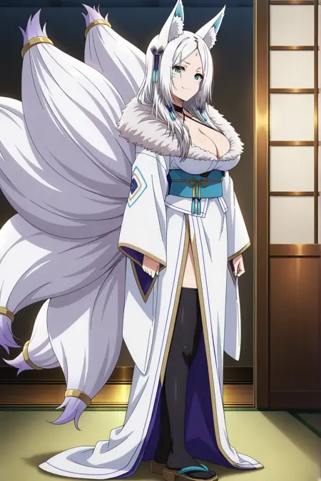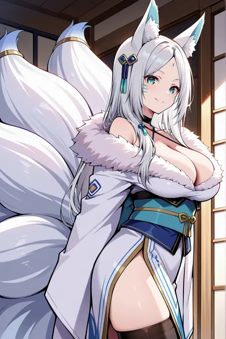 Appearance: white hair, long hair, parted bangs, forehead mark, fox ears, fox tail, multiple tails, animal ear fluff, slit pupils