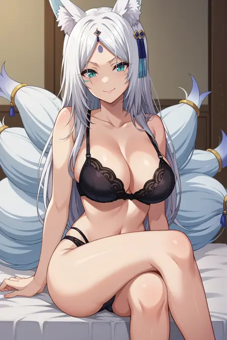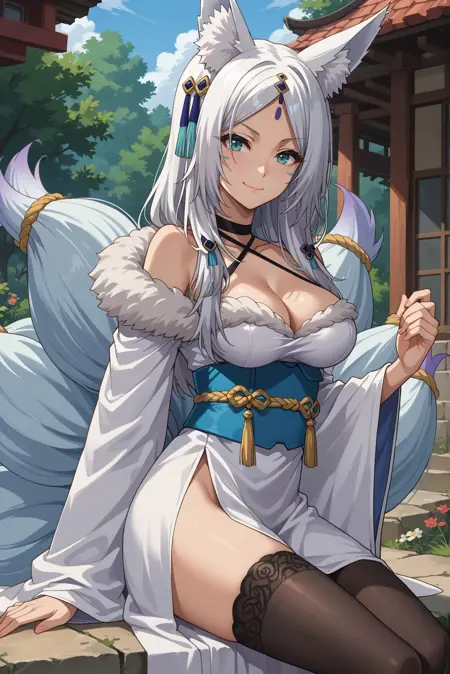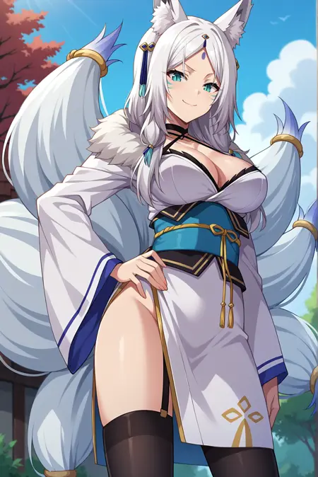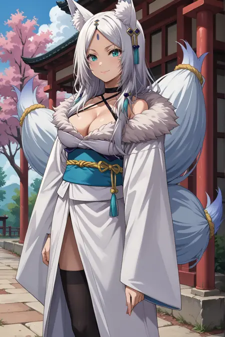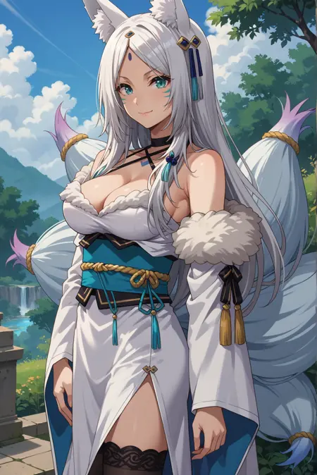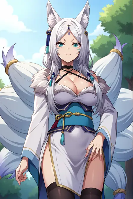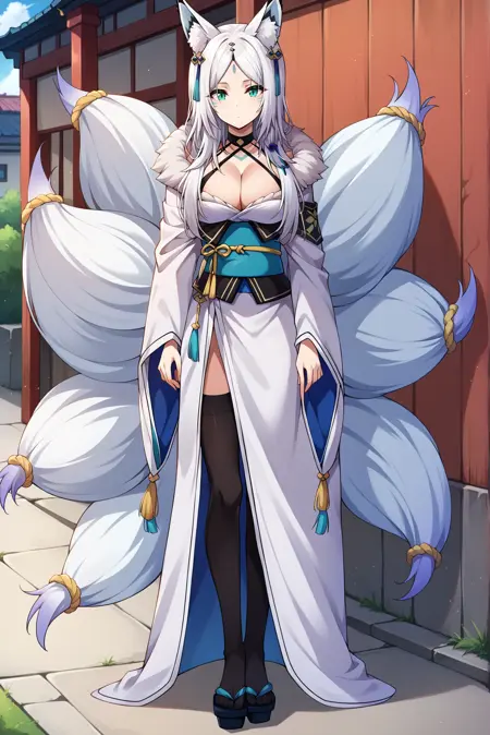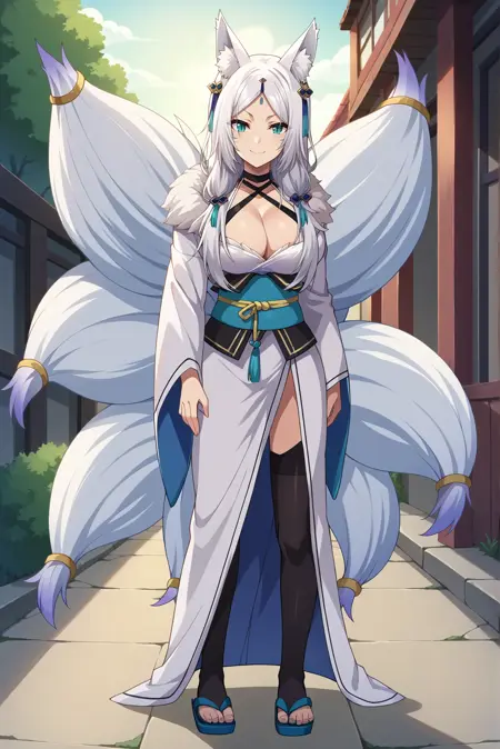 외모: 흰색 머리카락, 긴 머리카락, 갈라진 앞머리, 이마 표시, 여우 귀, 여우 꼬리, 여러 개의 꼬리, 동물 귀 털, 수직 동공