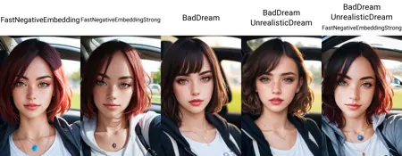 BadDream은 "DreamShaper 스타일"의 이미지 생성에 적합합니다. 반면 UnrealisticDream은 현실적인 이미지를 만들 때 더 효과적이지만, 개별적으로는 사용할 수 없습니다. 반드시 BadDream이나 다른 음성 키워드와 함께 사용해야 합니다.