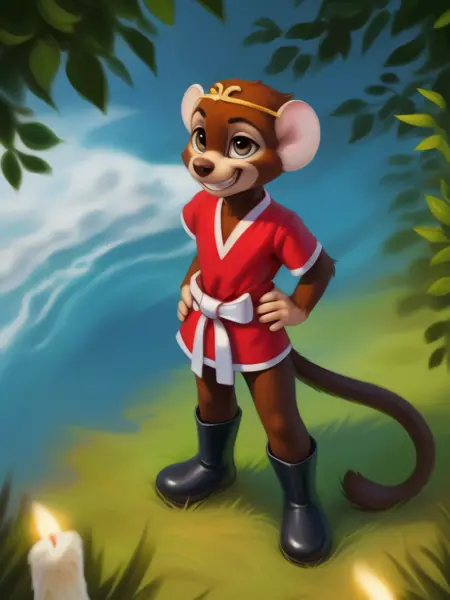 TezOsaMonBokSon, primate, monkey, red shirt, white belt, golden headband, black boots, chibi,