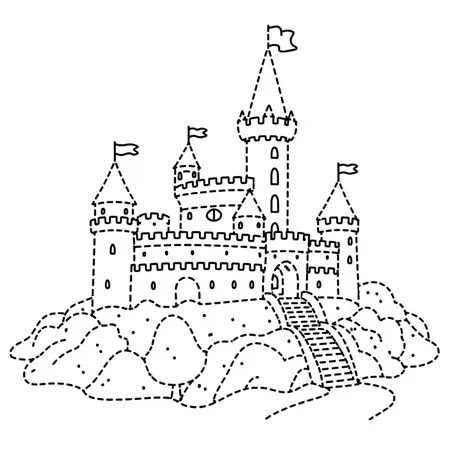 • "illustration of a towering medieval castle with pointed towers and a drawbridge, drawn in Dashed Line Drawing Style. The castle sits on a hill surrounded by trees, with flags waving from the towers."