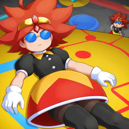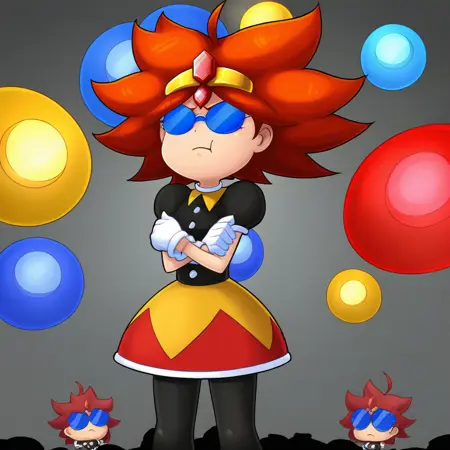 blue eyes, orange hair, short hair, spiked hair, ahoge, round blue-tinted sunglasses, tiara, forehead jewel,