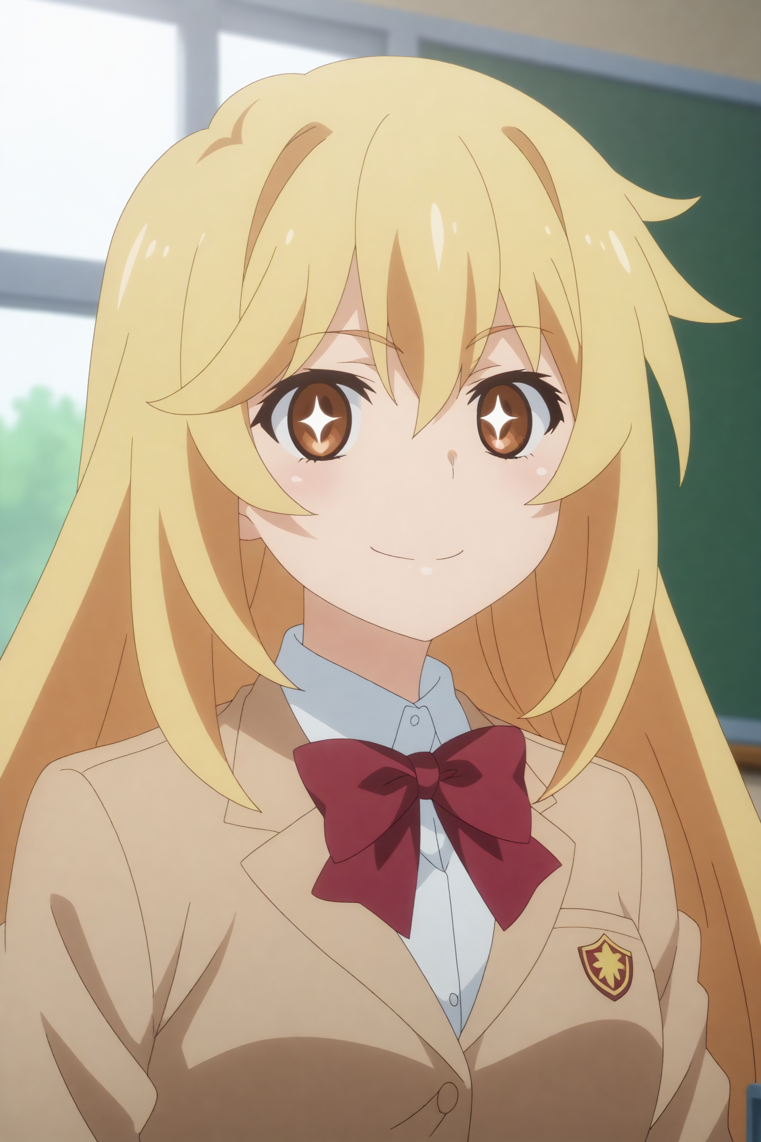 트리거: 쇼쿠호 미사키, 1소녀, 싱글, 도키와다이 학교 유니폼, 학교 유니폼, 반짝이는 눈, 갈색 눈, 긴 머리, 기호 모양의 동공, 도키와다이 학교 유니폼