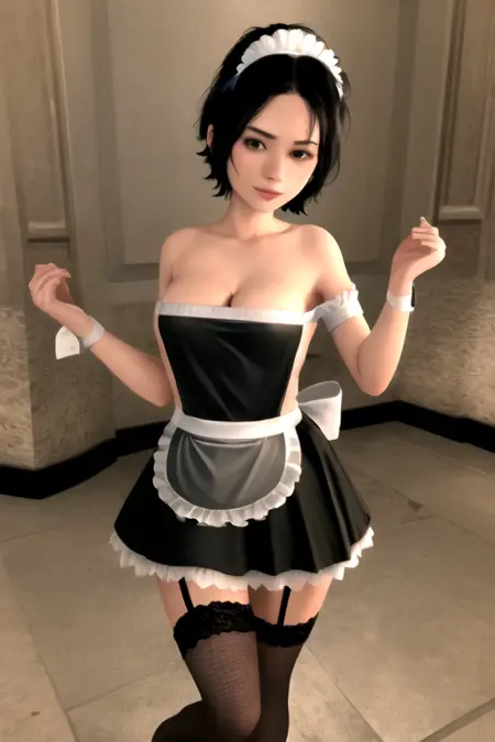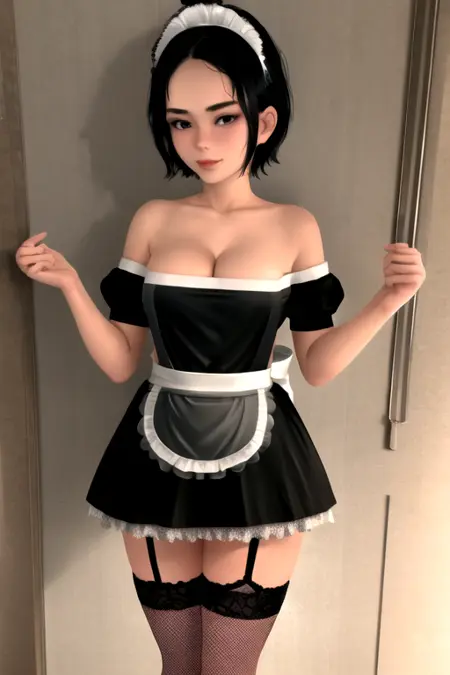 KittyPousix, 1girl, solo, short hair, black skirt, black hair, fishnet thighhighs, cleavage, bare shoulders, medium breasts, black eyes, apron, maid headdress, garter straps