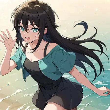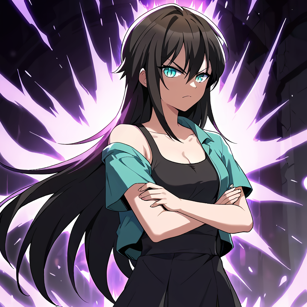 rurin, 긴 머리, 검은 머리, 청록색 눈, 가로동공, 눈 사이의 머리카락, 앞머리, 옆머리, 쇄골, 가슴, 작은 가슴,
