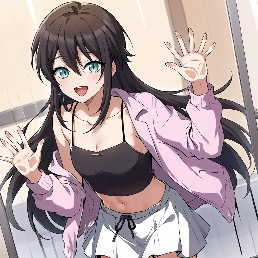 가슴 선, 배꼽, 허리 노출, 검은 캐미솔, 분홍 재킷, 여는 재킷, 흰 치마,