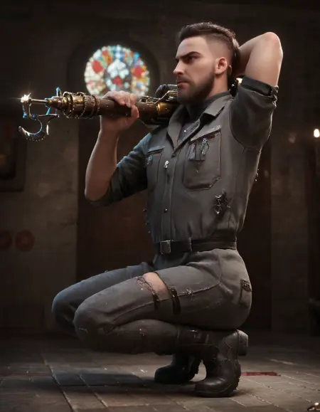 Prompt: Major_Nechaev, solo, short_hair, black_hair, 1boy, jacket, upper_body, hold weapon, weapon, male_focus, facial_hair, beard, realistic