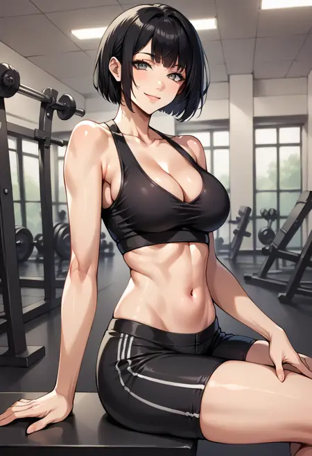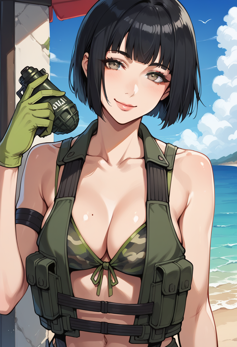 "NMHHolly, 검은 머리, 짧은 머리, 밥 컷, 캠플라주 비키니, 노출되는 옷, 하중 부하 조끼, 녹색 장갑, 유틸리티 벨트, 수류탄, 비대칭 하의, 한쪽 허벅지 긴 양말, 한쪽 기계식 다리"