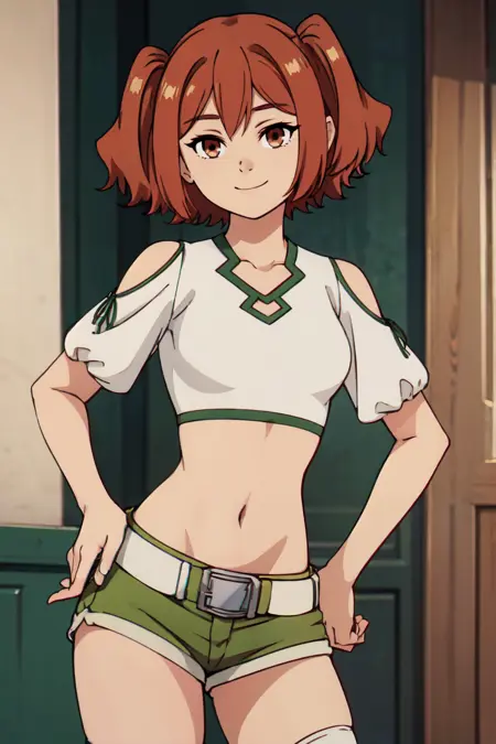 zzKanne, short hair, brown hair, twintails, brown eyes, shirt, thighhighs, navel, bare shoulders, white shirt, short sleeves, midriff, belt, white thighhighs, crop top, short shorts, clothing cutout, shoulder cutout, green shorts