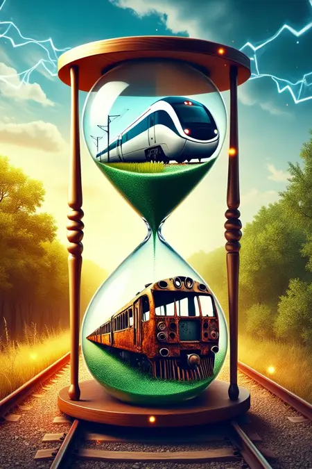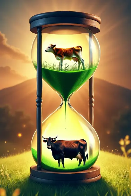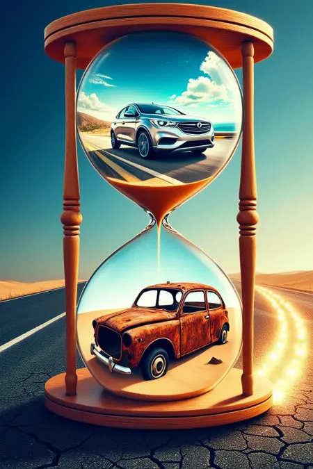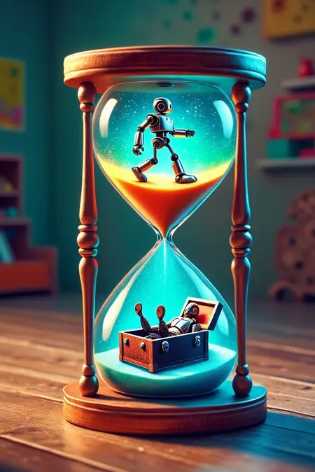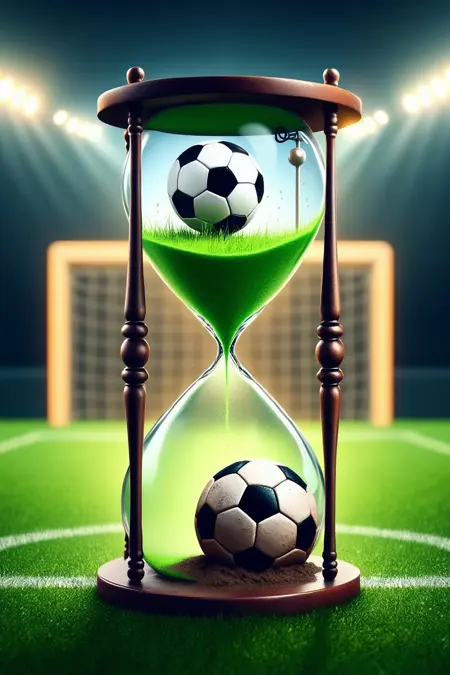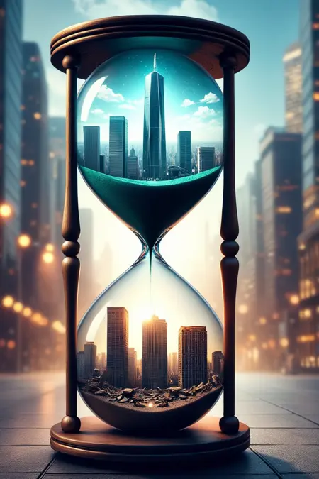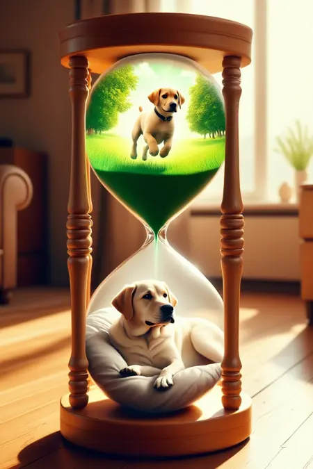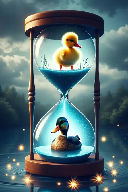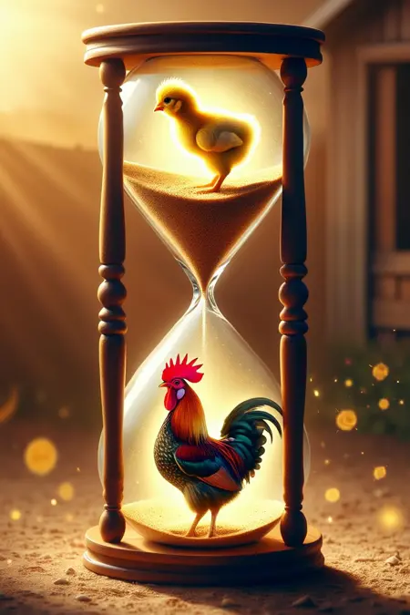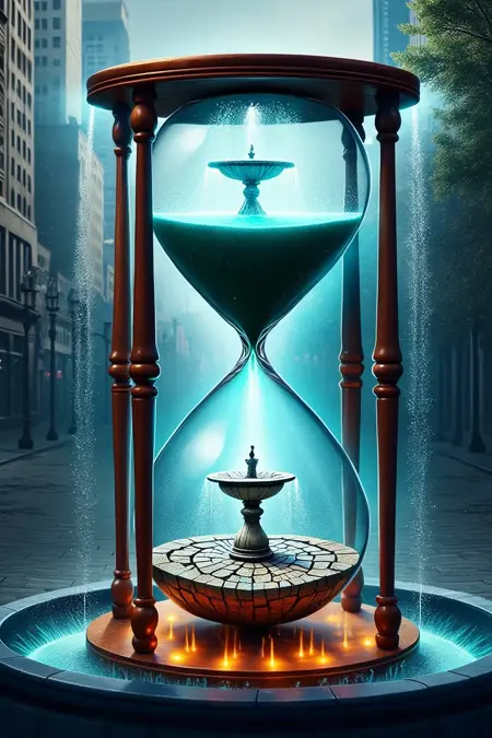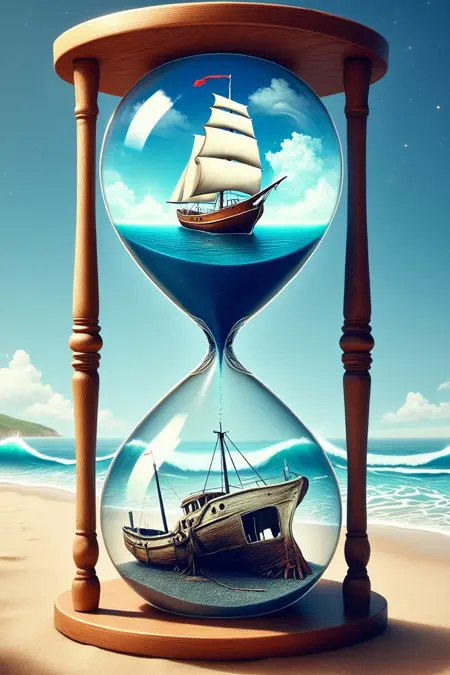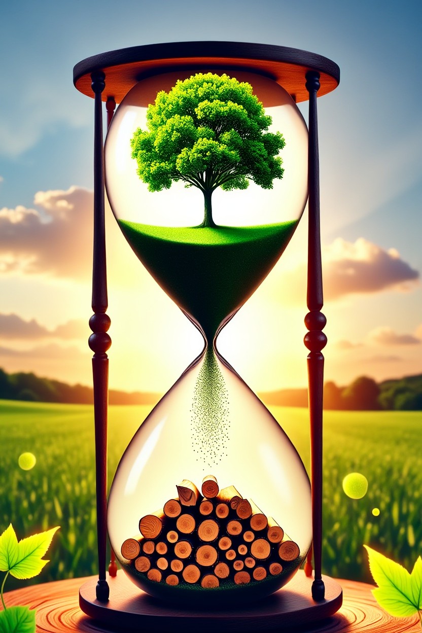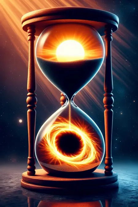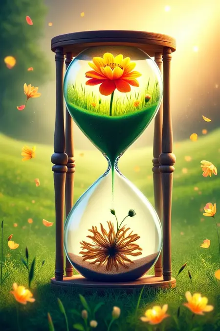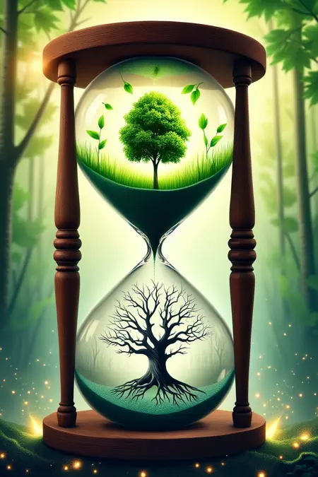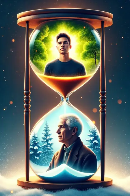 Hourglass style. Hourglass Top: 푸르른 숲 속에 서 있는 젊은 남자, 배경에는 태양이 환하게 빛나며 청춘의 에너지와 활력을 상징. Hourglass Bottom: 눈 덮인 겨울 풍경에 서 있는 노년의 남자, 차분하고 성찰적인 표정으로 지혜와 시간의 흐름을 상징. Background: 모래시계는 부드럽게 빛나는 눈 위에 놓여 있으며, 중앙에서 따뜻한 빛이 퍼져 청춘과 노년의 연결, 그리고 피할 수 없는 시간의 흐름을 묘사.