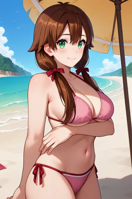 触发词为 "roroa",且必须包含 "棕色头发,长发,低双马尾,绿色眼睛,头发垂至肩部"。