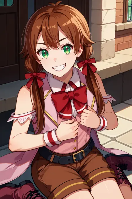 为呈现她典型的外观,请添加 "发带,有领衬衫,红色领结,粉色外套,无袖,腰带,棕色短裤,大腿绑带,腕带"。