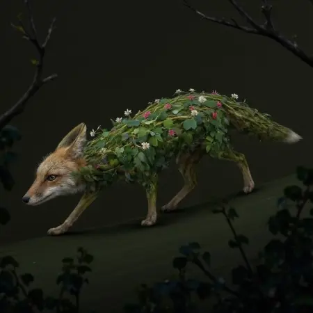 I want to create a set of interesting conceptual images, and need you to help me generate 20 corresponding prompts. The theme of the conceptual images is the combination of animals and plants. For example: a sheep whose body is made up of white cauliflowers. A frog standing on a leaf, its body made of strawberries.