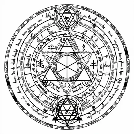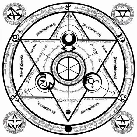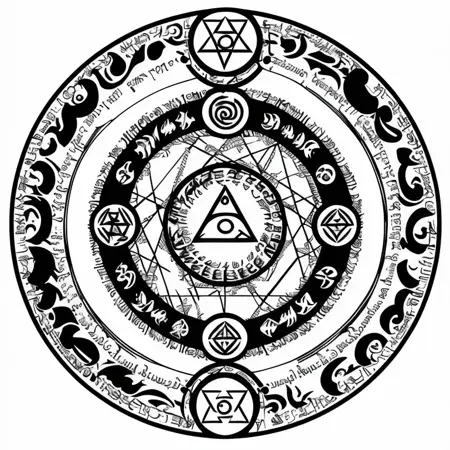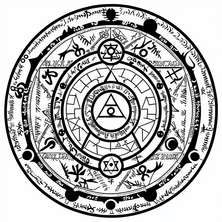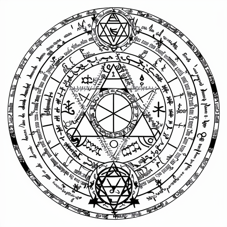 • nvjobmagiccircle 마법 소환 원반, 악마적인 요소, 지하 세계 문, 글자, 기호, 흰색 배경, 흑백, 단순함, 대칭적