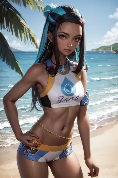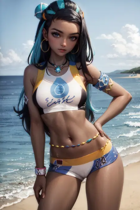 Default Outfit: nessadef, dark skin, makeup, single hair bun, crop top, single glove, spandex shorts, hoop earrings, belly chain, armlet, wristband