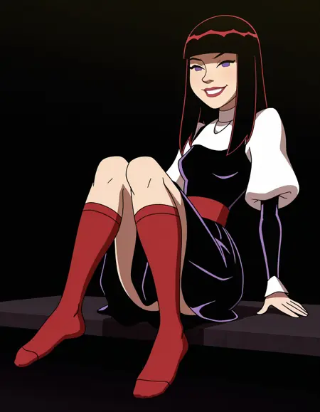 검은색 머리카락, 단정한 앞머리, 검은 드레스, 볼륨 있는 소매, 긴 소매, 양말, 빨간 무릎높이 양말, 플랫폼 신발
