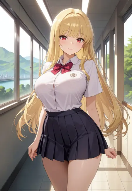 angelicaneon, 長い髪, まっすぐな前髪, 金髪, 赤い目, 色付きの内側の髪, 多色の髪, 緑の髪, 黒い頭部装具, メイク, 赤い顔の模様, 赤いチョーカー, 白いノースリーブの短いトップス, 胸元, 黒いウエストストラップ, へそ, 黄色い腕バンド, 黒い肘当て, 黒い手袋, 透け感のある黒いスカート, 黒いパンツ, 黒いベルト, 黒いポーチ, 黒い太ももストラップ, 黒い膝当て, 不対称な脚の装備, 黒い片方の太ももハイ, 黒い片方のフィッシュネット膝下ソックス, 白いスニーカー,