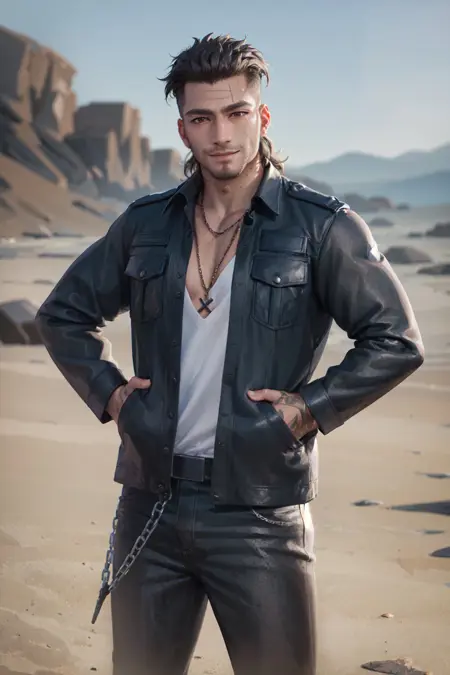 Default Outfit: jacket, short sleeves, black pants, necklace
