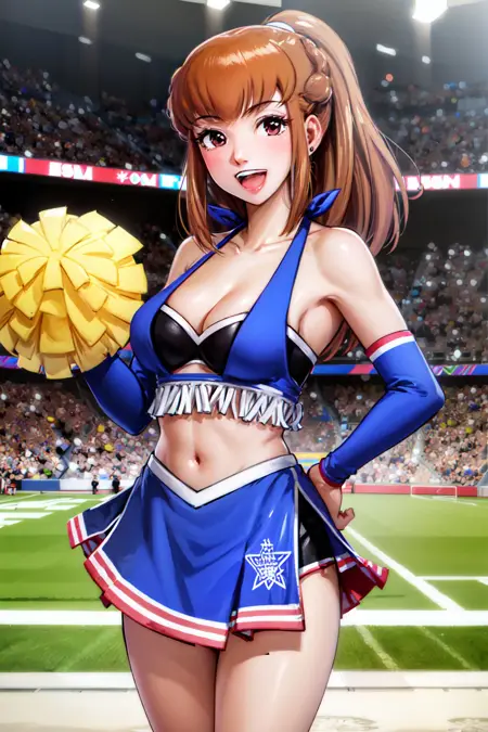 Default Outfit: cheerleader, pom pom \(cheerleading\), skirt, midriff, cleavage