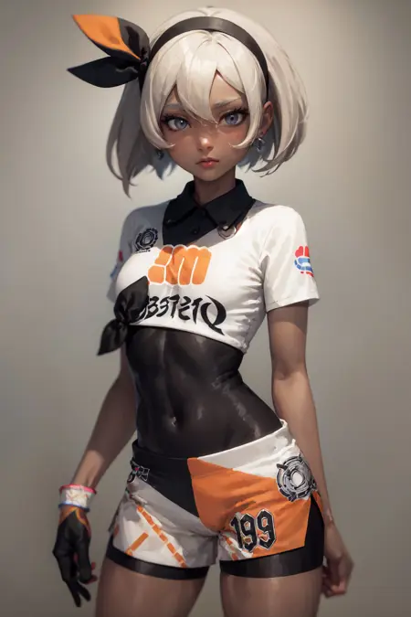 Default Outfit: hairband, collared shirt, bodysuit under clothes, print shorts, single glove
