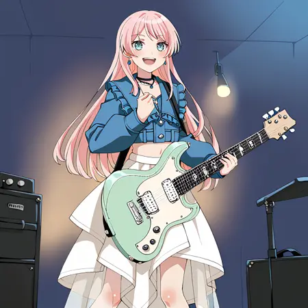 chihayaanon2, canonid2 earrings, canonid2 choker, canonid2 cropped jacket, canonid2s skirt, canonid2 boots, canon2 electric guitar, holding instrument,