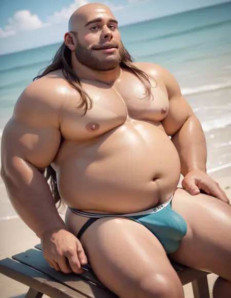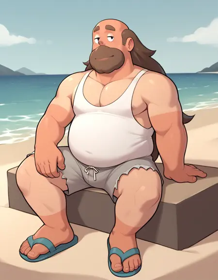 GregUniverseIL, 1boy, male focus, tan line, fat, beard, black eyes, long hair, brown hair