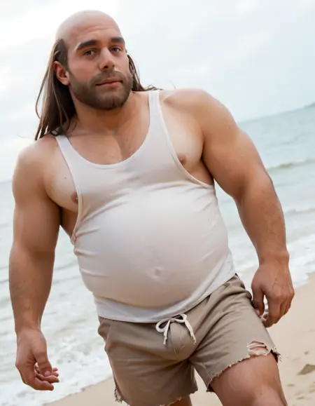 GregUnivP, 1boy, male focus, tan line, beard, black eyes, chubby, long hair, brown hair
