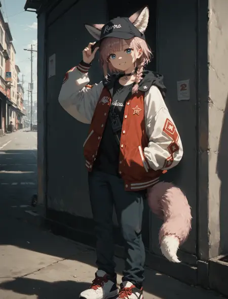 single braid, sus_jacket, black shirt, black pants, baseball cap, ears through headwear, black choker, sus_sneakers,